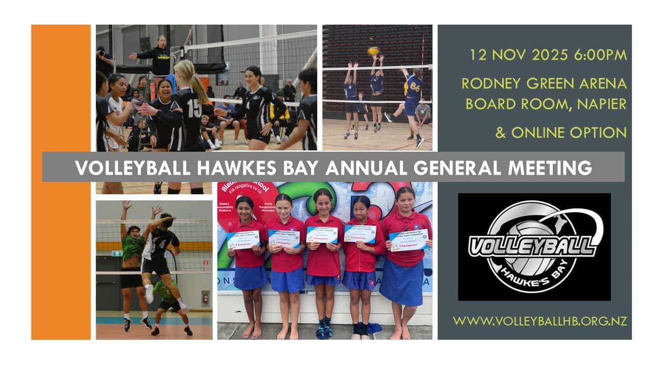 The Volleyball Hawkes Bay AGM will take place 7pm 12th November 2025 in the Board Room upstairs Rodney Green Arena Hawkes Bay, Gloucester Street Taradale, Napier.